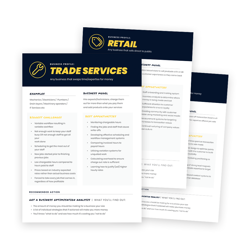 If you hear yourself saying “I need more MONEY out of my business!”, then watch the 10 minute video on MARGINS for a quick-fix… If you’re saying “I need more TIME out of my business!”, then watch the video on PRODUCTIVITY for a quick-fix… If you’re saying “I need more LEADS for my business!”, then watch the quick-fix on MARKETING…